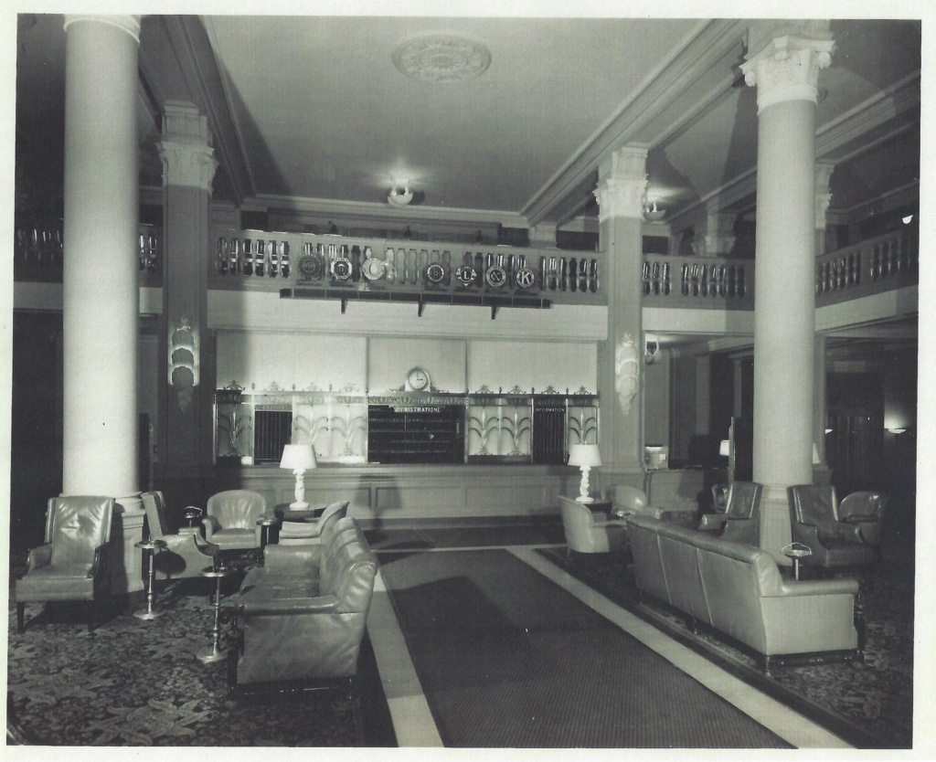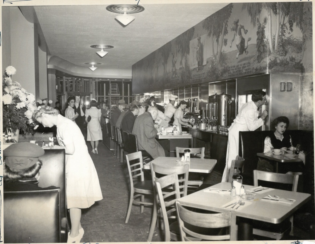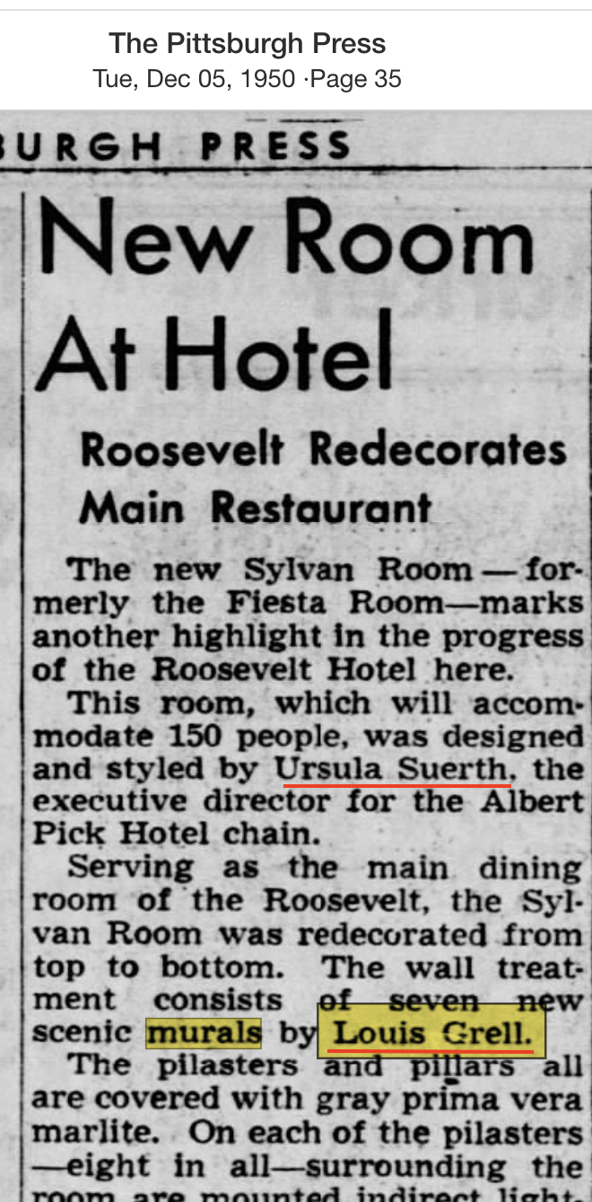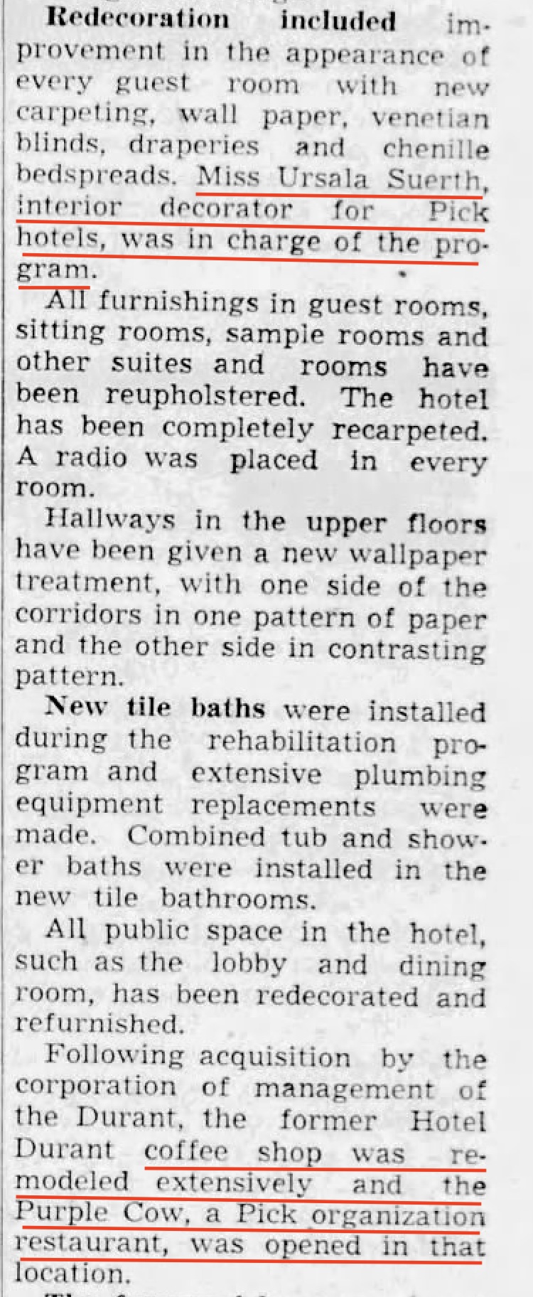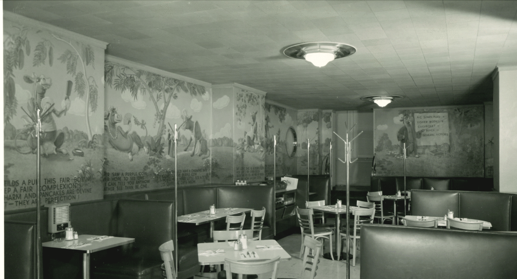 Beginning in March 1941, the Hotel Durant (named after William “Billy” Durant [1861-1947] co-founder of General Motors and founder of the Frigidaire brand) was renamed the Pick-Durant after the Albert Pick Hotels Corporation (Pick Hotels) acquired rights to the property and commissioned Louis Grell to paint his popular Purple Cow murals for the newly remodeled coffee shop. At least eleven murals were created and installed in early 1941. Pick Hotels further announced in June, 1942 it had purchased the property outright and recently completed a 15 month remodel of the remainder of the hotel. The interior was redecorated under the supervision of Pick Hotels Executive Decorator Miss Ursala Suerth, who worked closely with Grell on countless Pick hotel improvements. It was common for Grell to be commissioned to paint murals for the lobby, a restaurant or ballroom and the Purple Cow shop all under one roof totaling as many as twelve or more individual murals for one hotel site. Grell painted the murals in his Chicago studio, then shipped them to the location to be installed by local artisans. There is no evidence to date that Grell signed any of these murals. Grell painted murals for at least eight Purple Cow shops before the Durant. Each location had one locally themed mural also created by Grell that would have a local competition for the poem to be later written onto the bottom.