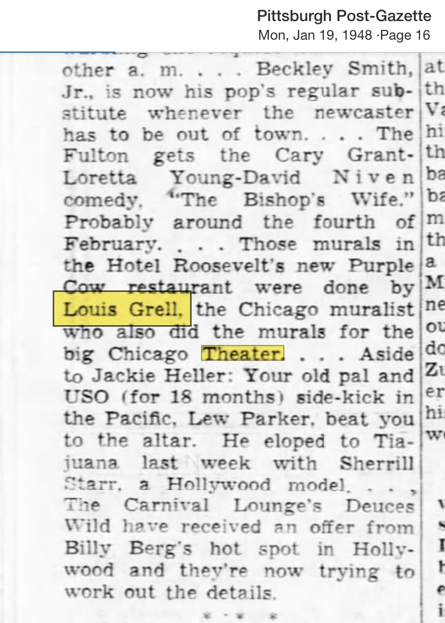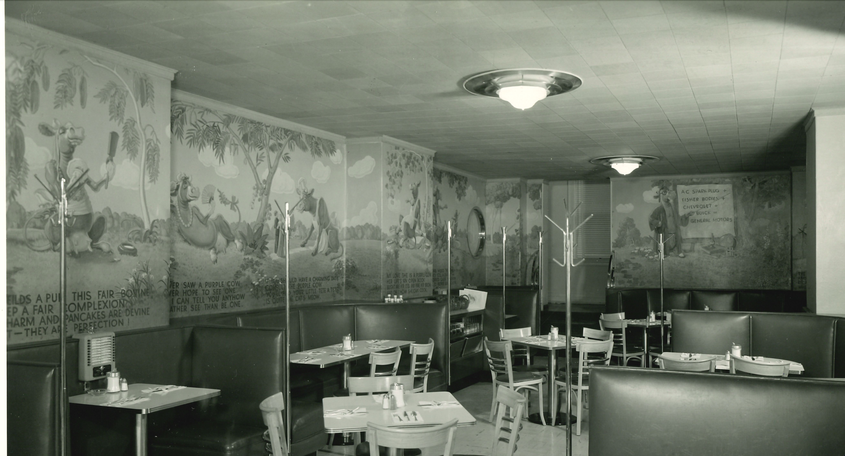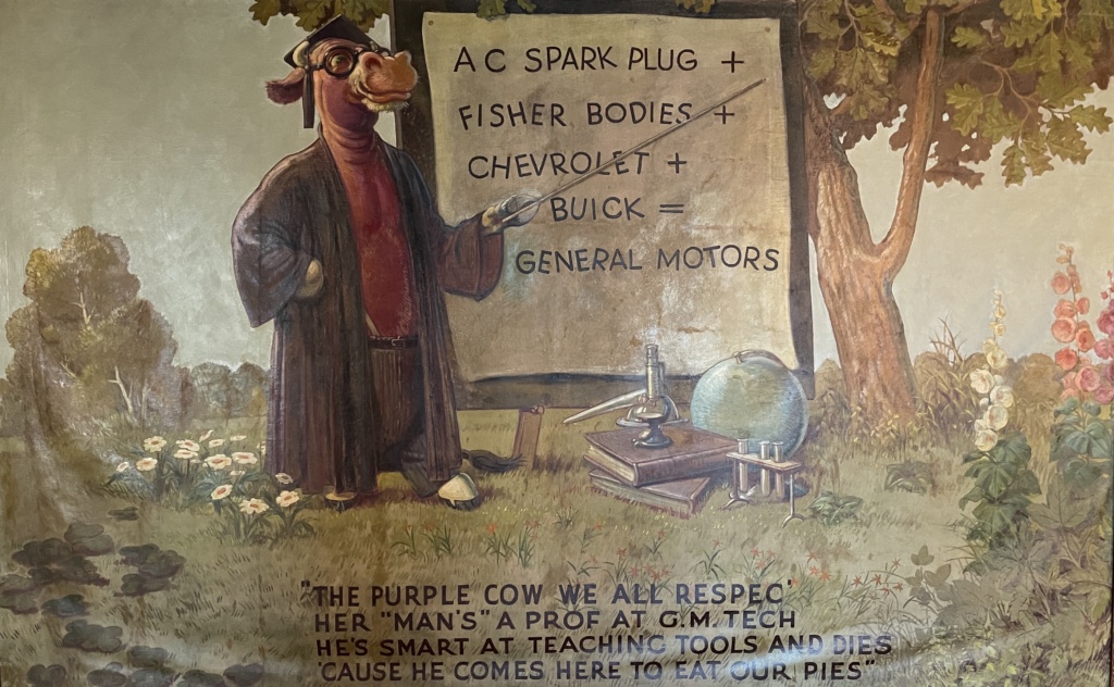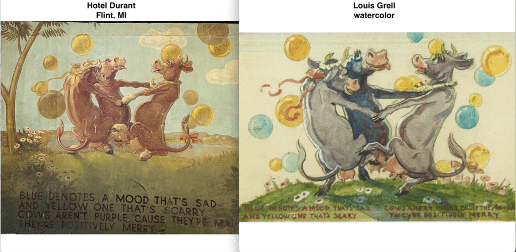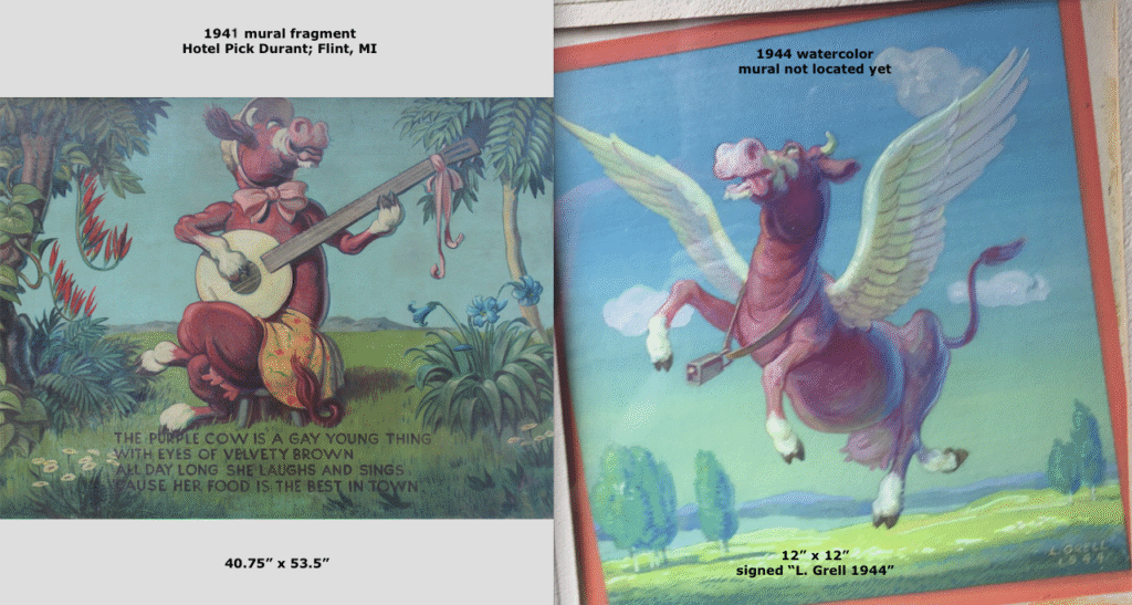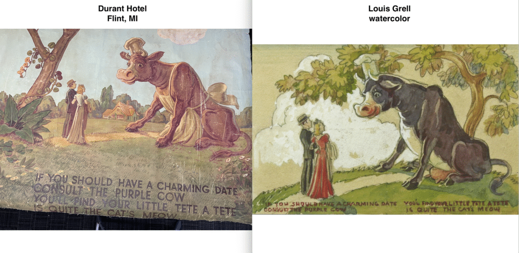 A visit by Grell researchers to Flint in September 2022, to Factory One and Kettering University Archives was a huge success and wonderful time. We also visited the Sloan Museum of Discovery and found additional archives related to the Pick-Durant murals by Grell. We have established that at least eleven Purple Cow murals were painted by Grell for the Pick-Durant, who may have also painted another mural inside the Adams room, a larger eating establishment inside the Durant (see photos above).
