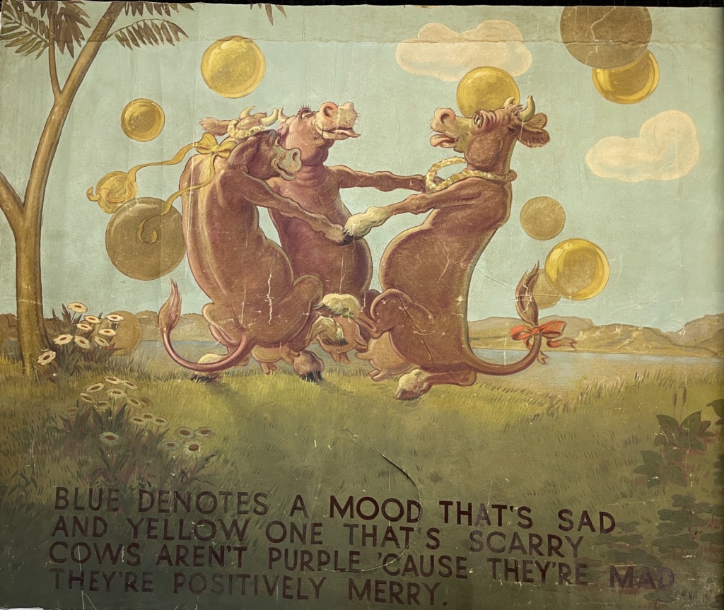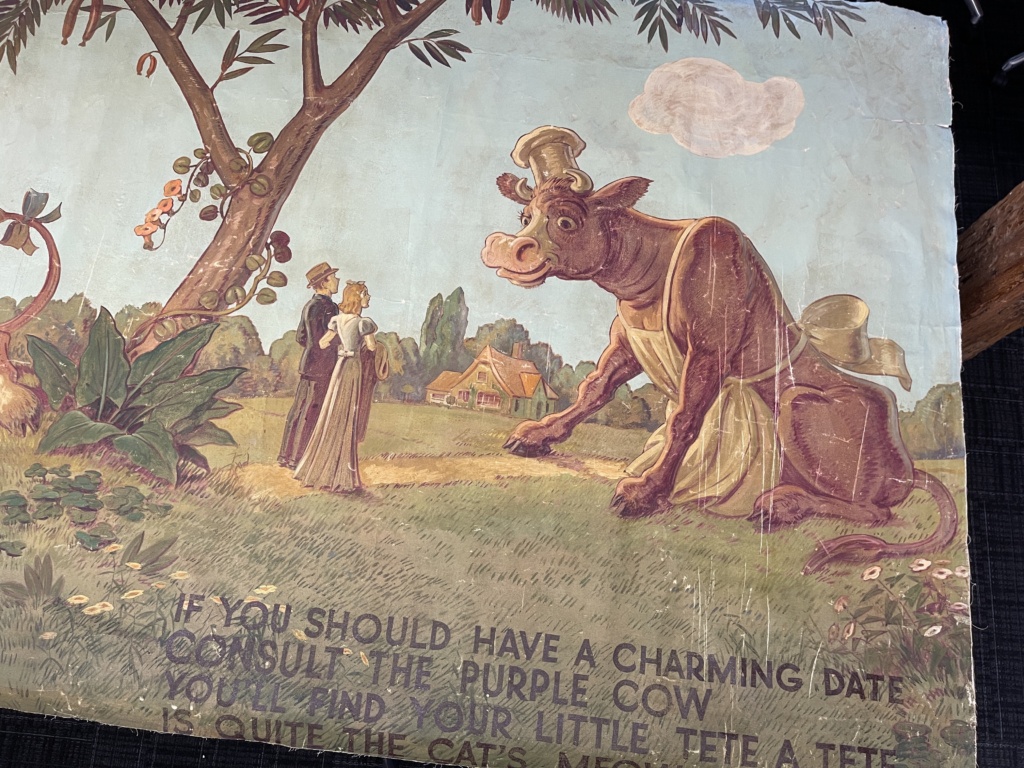 YOUNG THING – Celebrating the gaiety of times while having fun with the Purple Cow ice cream and sandwich shop themes. This salvaged fragment depicts a banjo playing bovine with her beautifully colored cooking attire hoofing away on the strings. A simple visual analysis of the two YOUNG THING murals confirms they are two distinct murals. The foliage surrounding the seated bovine strumming on the banjo is completely different at the two know locations. This oil on canvas perfectly conserved mural is from the Hotel Durant.