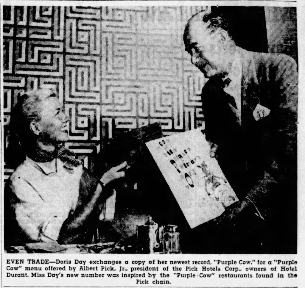 Doris Day and Albert Pick Jr., EVEN TRADE; likely taken at the Hotel Durant (The Flint Journal August 6, 1953 page 25).