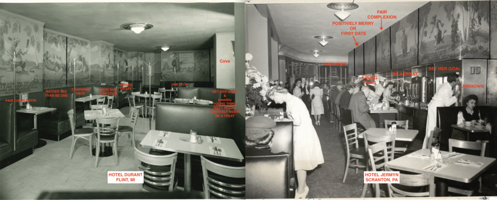 In the above left photo of the Durant, there likely was at least one more mural to the left of FAIR COMPLEXION because you can see another booth. In the cove to the right of GM TECH we have SET HER GOAL and likely two more murals. Presumably, murals were also on the wall behind the camera. Eleven total known murals at the Durant.