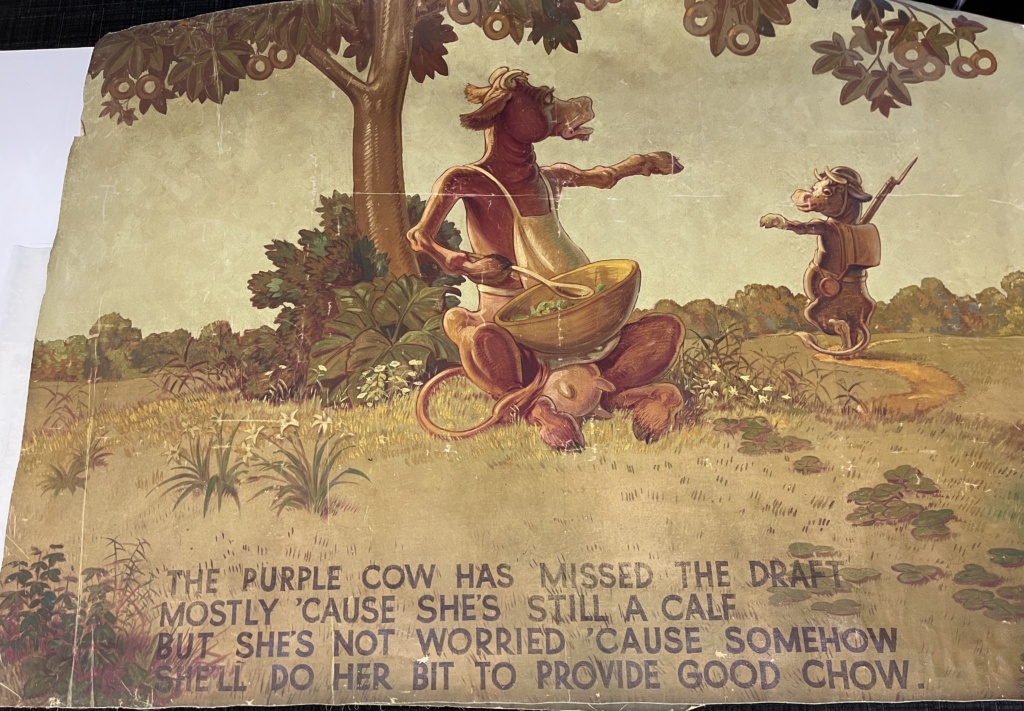 The included four watercolors (shown in the above photo montage) were drawn by Grell in c1940 during this period and also adopted into the 1940 ad for the Pick Hotel Miami in Dayton. It is estimated by our research that as many as seventy Purple Cow murals were imagineered by Grell.