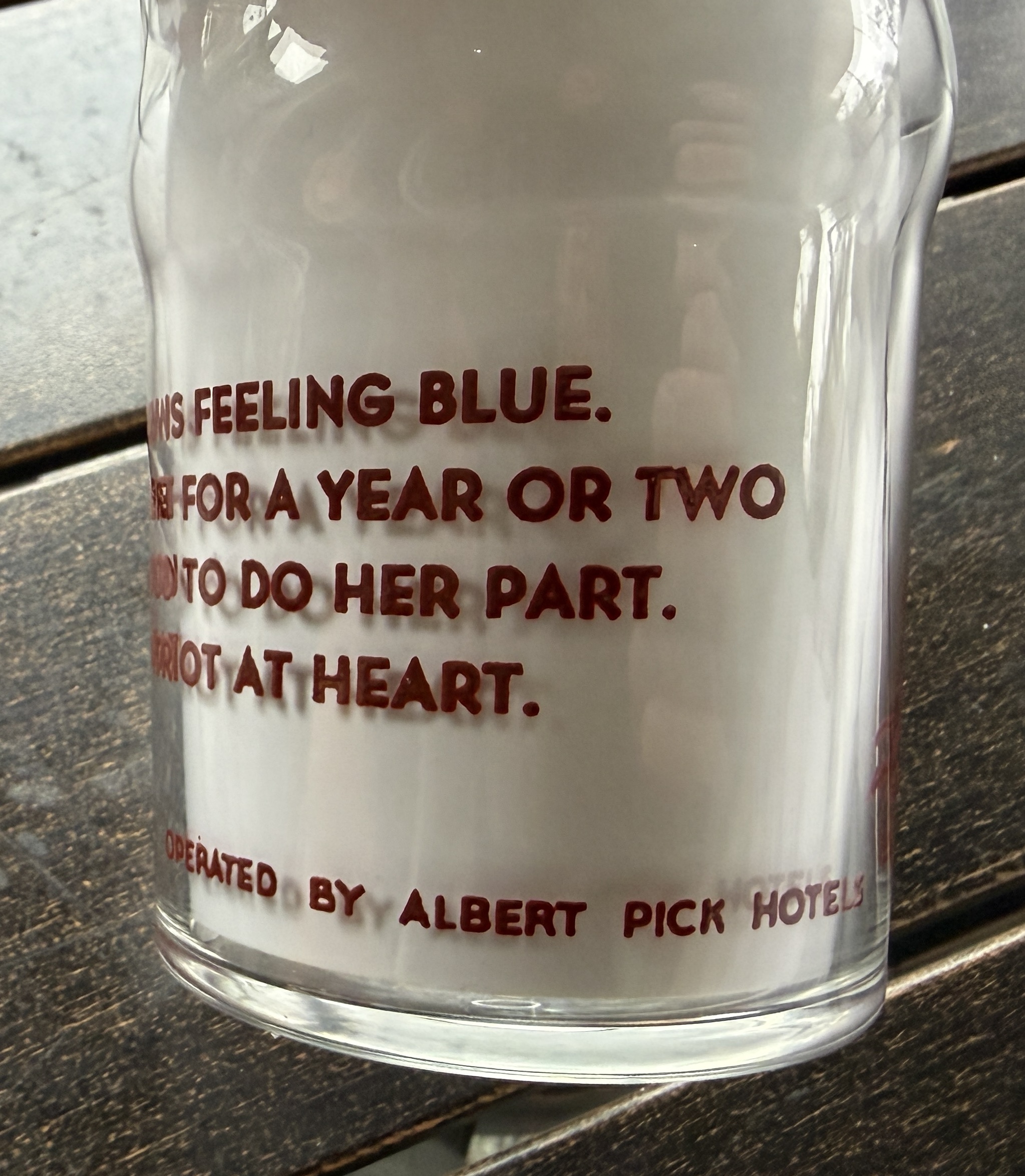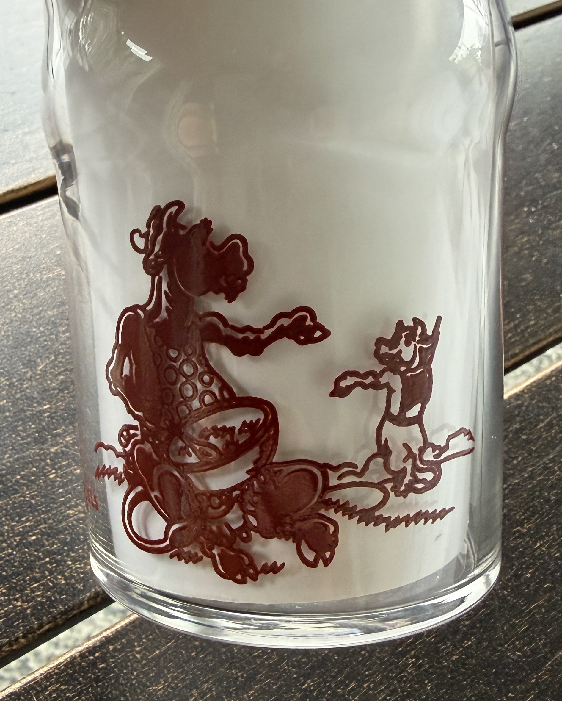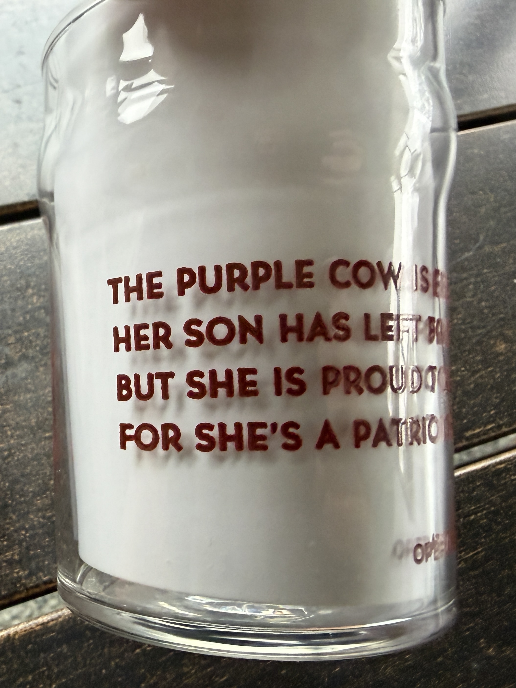 This Purple Cow glass with a sketch very similar to Grell’s MISSED DRAFT mural has a different poem than the one in the Durant indicating that possibly different jingles were used under the same cow scene: