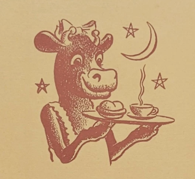 The eleven known Purple Cow murals at the Pick-Durant are: HOW SHE CAN COOK, GM TECH, DIZZY HEIGHT, MISSED DRAFT, FAIR COMPLEXION, CHARMING DATE, RATHER SEE THAN BE, POSITIVELY MERRY, BE A TREAT, SET HER GOAL and YOUNG THING. During a December 1952 and January 1953 remodel of the coffee show The Flint Journal reported “[t]he murals will be changed slightly (December 18, 1952 p. 4).” This is likely when a local artist was hired by the hotel manager to paint over some of the clouds. Although clouds were not used in the Hotel Jermyn Purple Cow cafe, clouds were a staple in many Grell productions including easel works. Grell reused many of the central characters of these murals for numerous other Pick Hotel Purple Cow shops throughout the hotel chain (see the Dayton Ohio ad, the four watercolors by Grell and the Pick Topicks magazine articles), but he would usually alter the scenery surrounding the cow. So far, research has established that no two Purple Cow murals were exactly alike.