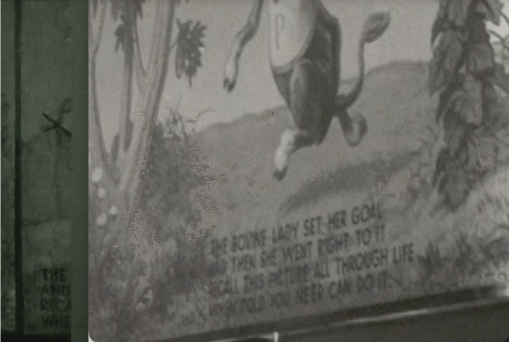 At the Durant, there was a hidden cove to the right of the GM TECH mural and it wasn’t until the photo of the Hotel Jermyn Purple Cow shop surfaced in mid-2025 that we were able to establish that SET HER GOAL is the partially shown mural. You can see “THE AND RECA’ WHE’” written on the wall. Compared to the Hotel Jermyn photo you can easily decipher the missing mural is SET HER GOAL. Presumably, YOUNG THING also would have been hidden in the cove at the Durant. The Hotel Jermyn photo shows FAIR COMPLEXION, BE A TREAT, YOUNG THING and SET HER GOAL murals. Two other murals are blurred in the photo above the far end of the counter and at least one other mural is cut off to the right of the photo.