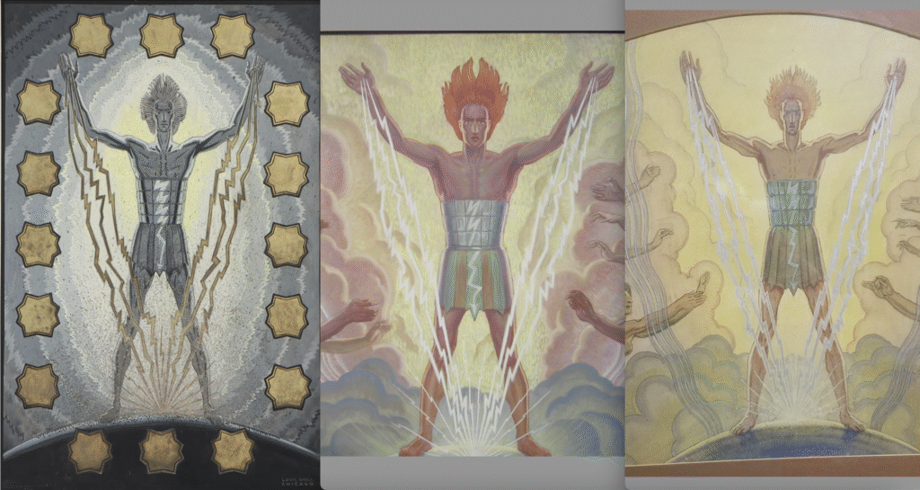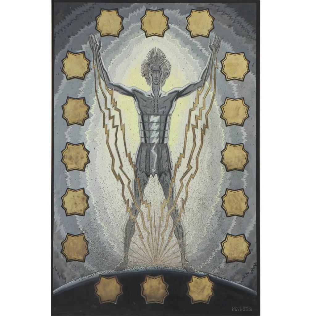This large painting was purchased by a Chicago artist from the Romano Galleries at Tree Studios artist colony, Chicago, in the late 1970’s and is in a private collection in St. Louis with the same owner. The buyer lived at Tree Studios in studio #22 when it was purchased. Possibly the world’s first super hero. The central figure, Captain Electricity, is shown charging the globe with lightening bolts shooting out of his hands as human figures fly around him in unison. When it was purchased, the seller told the current owner that it was a study for a large mural for the RCA Pavilion for the Century of Progress, 1933-34 Chicago World’s Fair.