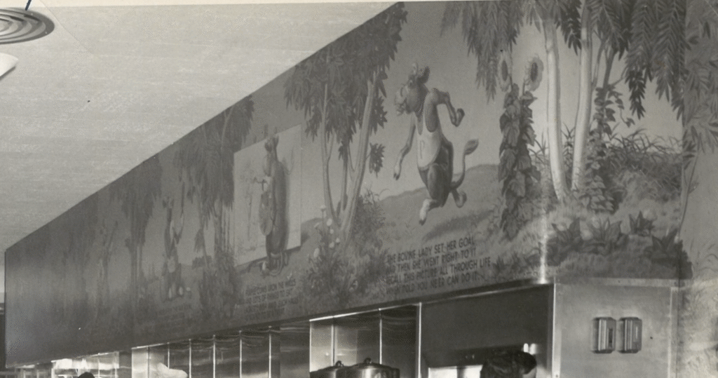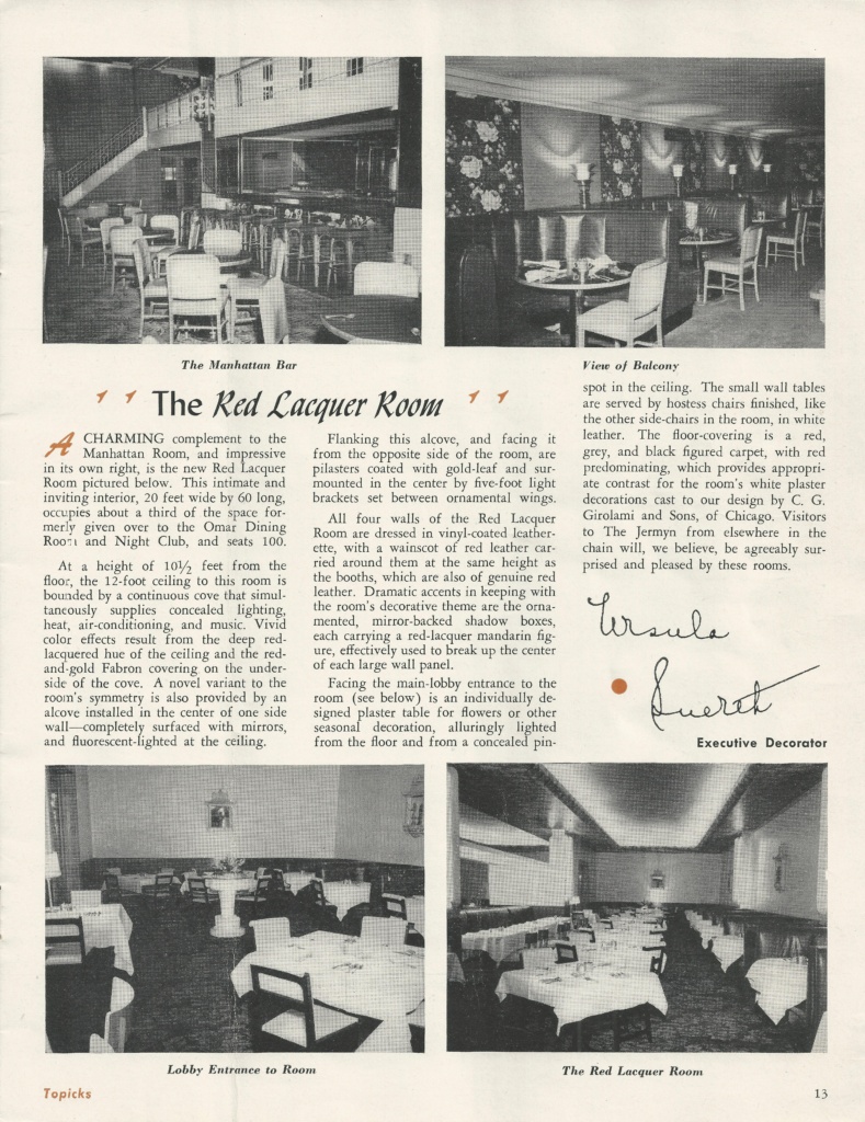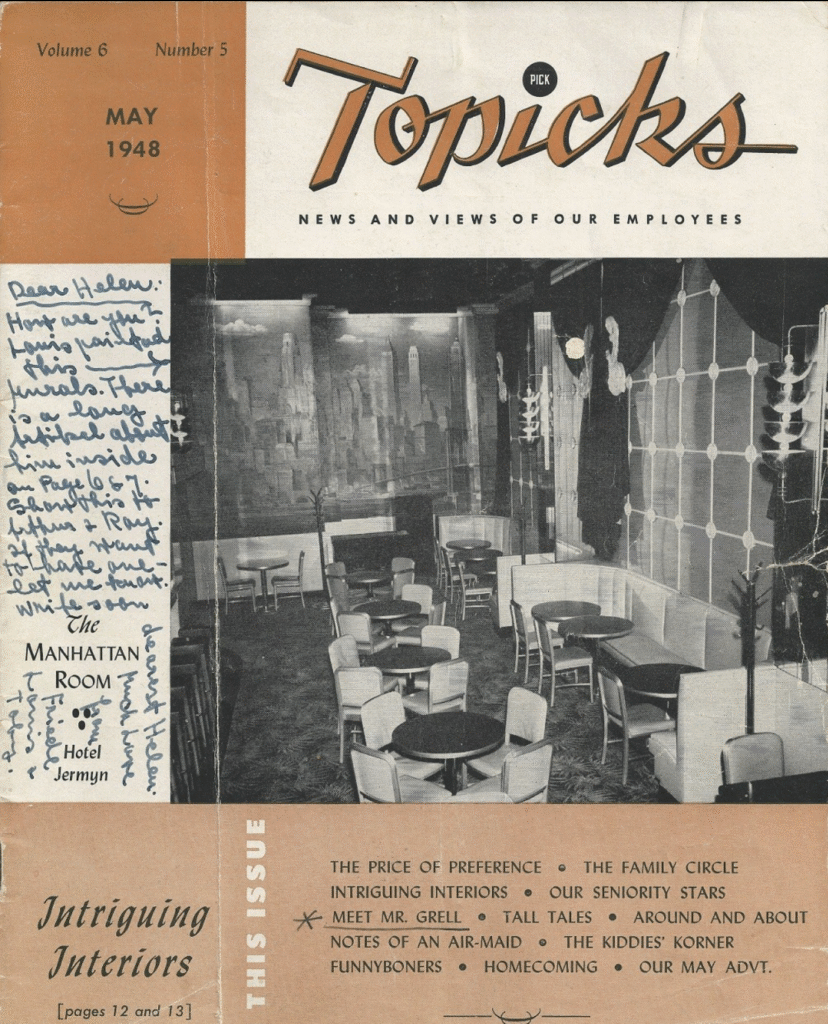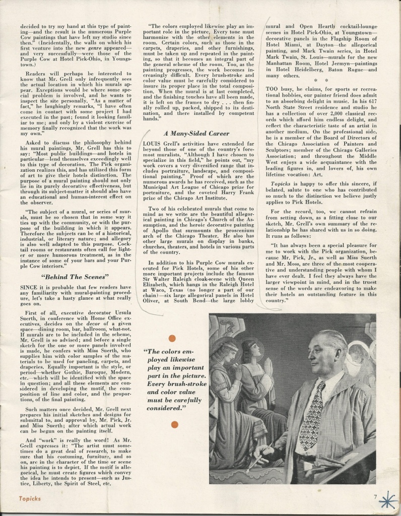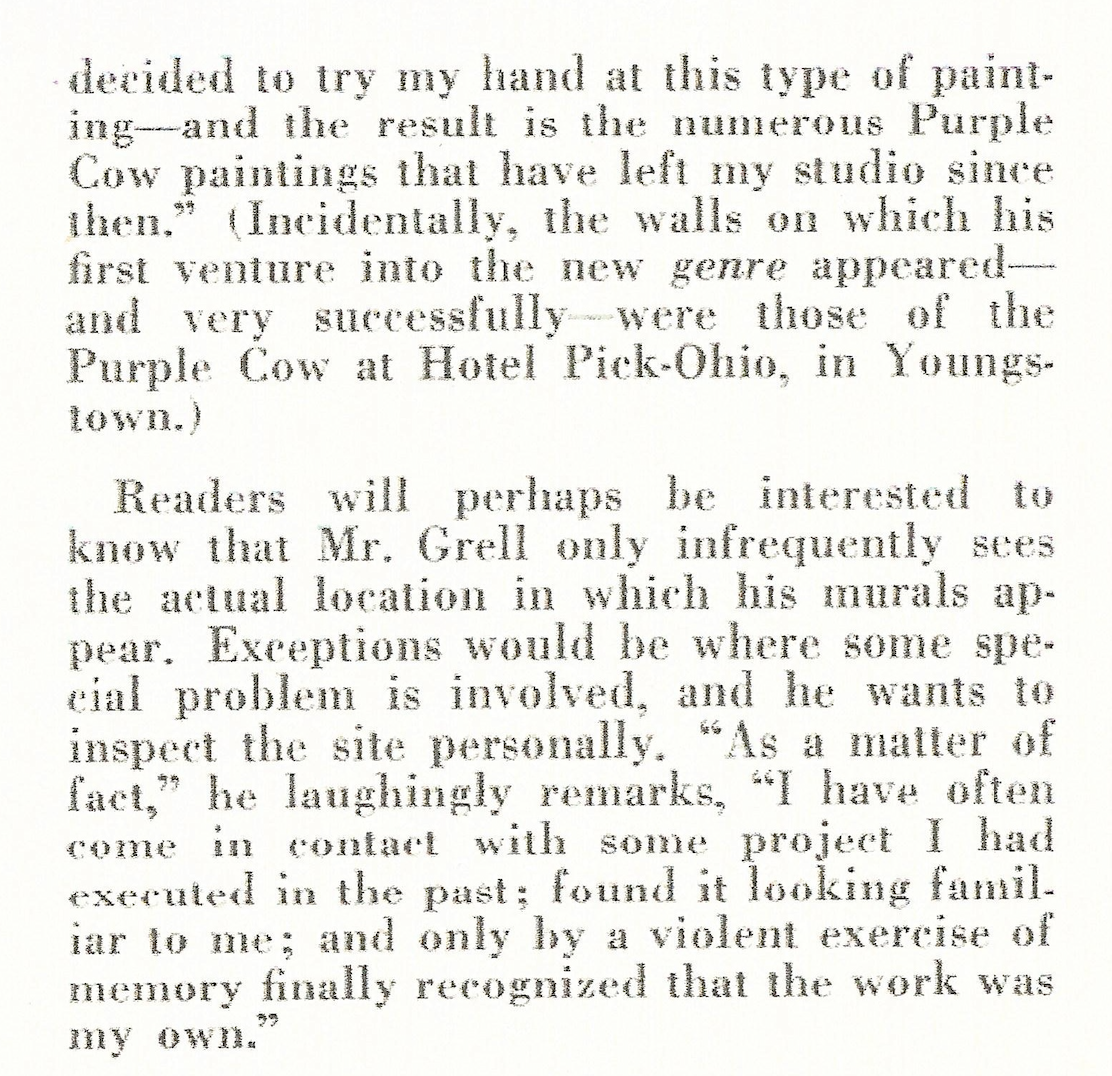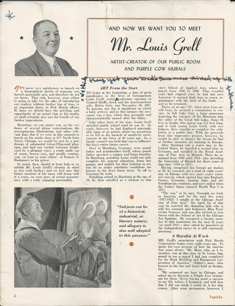 sources: Albert Pick Hotels Corporation’s monthly magazine Pick Topicks, May 1948 (vol. 6, no. 5) pages 6, 7, 10, 11, 12 & 13 and cover photo of the Manhattan Room with a photo reproduction of a Grell mural; inscribed by Fredricka Grell; Pick Topicks 1955 page 8; Black & white images are of the Hotel Jermyn Purple Cow murals compared to color images of the Hotel Durant Purple Cow murals.