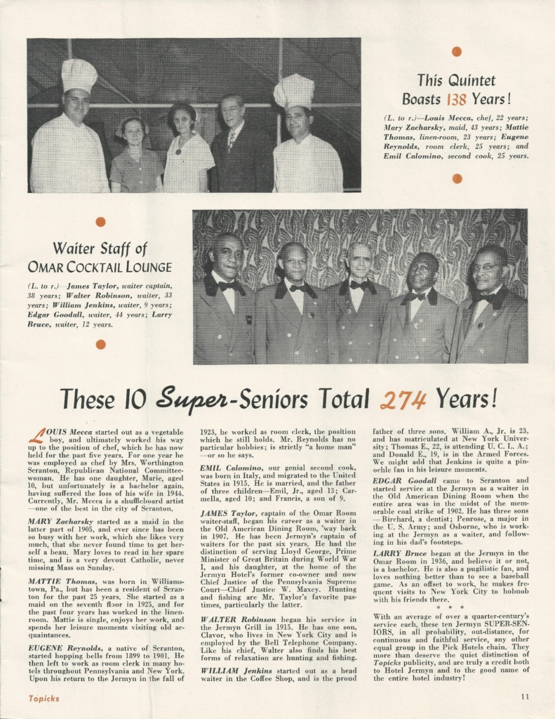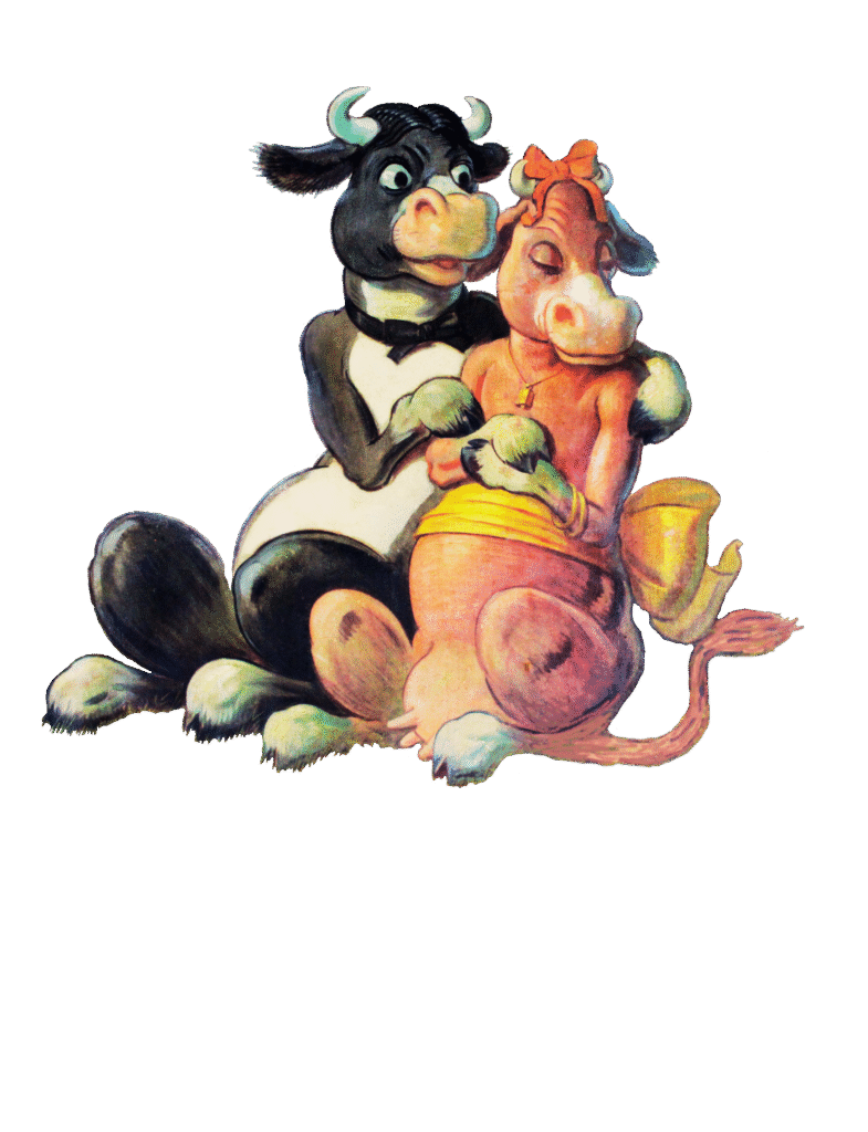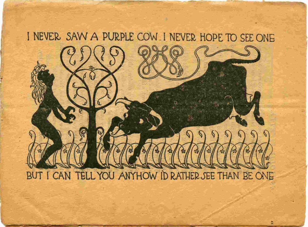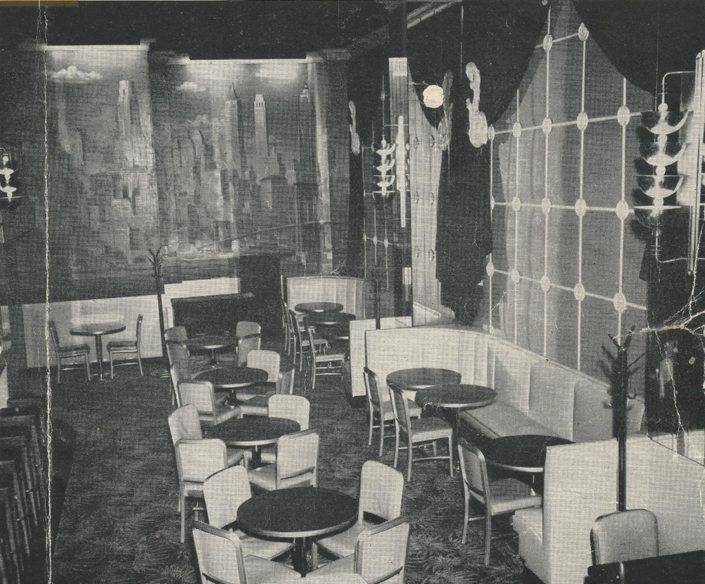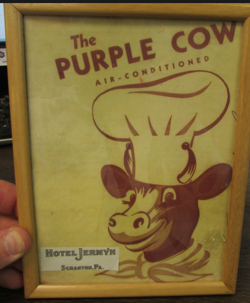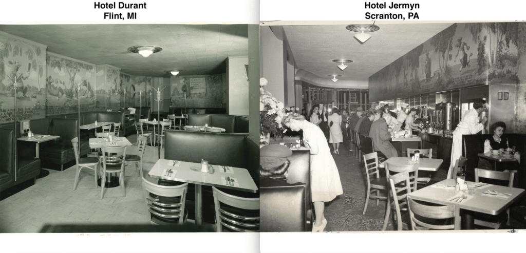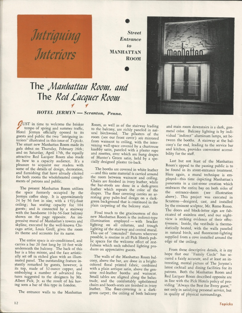 sources: Albert Pick Hotels Corporation’s monthly magazine Pick Topicks, May 1948 (vol. 6, no. 5) pages 6, 7, 10, 11, 12 & 13 and cover photo of the Manhattan Room with a photo reproduction of a Grell mural; inscribed by Fredricka Grell; Pick Topicks 1955 page 8; Black & white images are of the Hotel Jermyn Purple Cow murals compared to color images of the Hotel Durant Purple Cow murals.