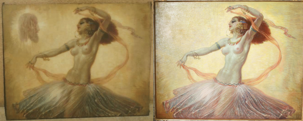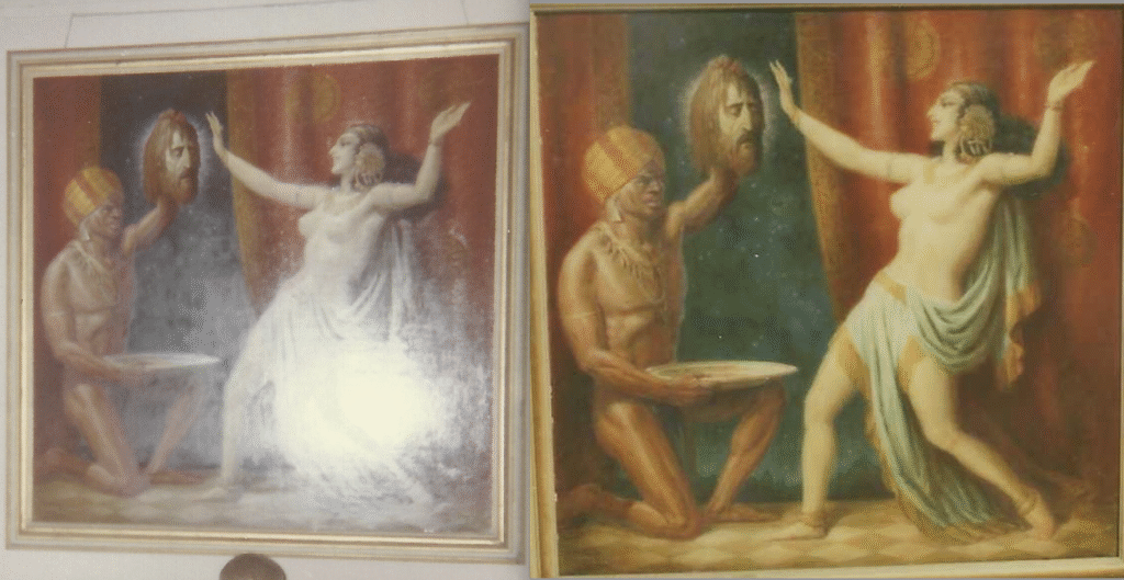 Dancing Salome with floating head of John the Baptist (later removed by an unknown person) photo has the painting dimensions as 40″ x 32″; the smaller oil on canvas photo has the dimensions of the smaller Salome painting as 30.25″ x 30.25″