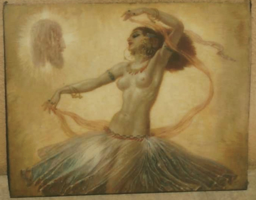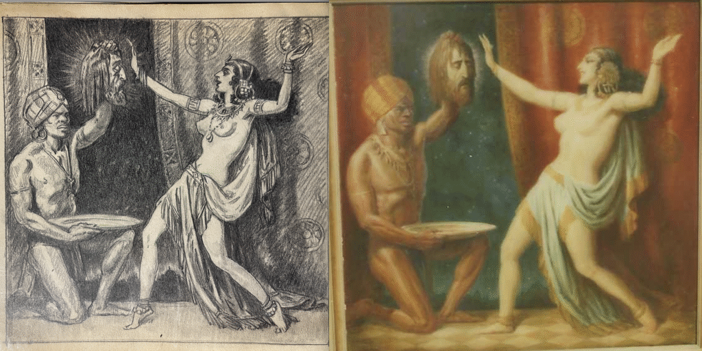 Sources: The Grell Spiral Sketchbooks collection (Romano / Schmidt; acquired in 2025). Two color photos of oil on canvas paintings with dimensions en verso; Dancing Salome with floating head of John the Baptist & Dancing Salome with executioner holding the head of John the Baptist and a platter.