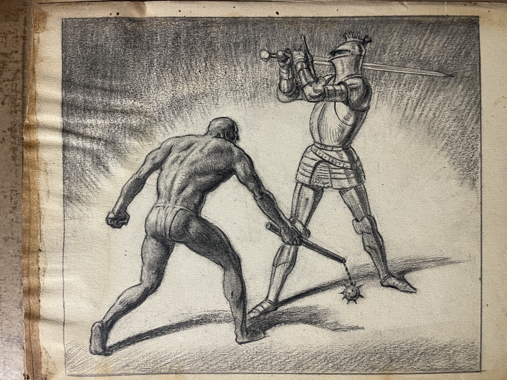Collection includes six Brudno spiral bound sketchbooks with study’s for completed and many unknown paintings mostly on sheets measuring 9″ x 12″ from 1930’s to 1950’s (some are loose) and one separate portrait sketch all by Grell. Most of the actual sketches measure 8″ x 10.875″. The collection totals some 145 individual graphite drawings, many with gouache highlights, but also includes numerous watercolors. A signed descriptive letter from James Romano, Tree Studio former resident and artist, owner of Tree Studio Gallery Art Antiques and Tree Studio Art Antiques, accompanies the collection. Romano moved into Grell’s studio after Mrs. Friedl Grell entered a German nursing home in a Chicago suburb. Romano acquired the sketchbooks directly from Friedl and Grell’s estate attorney around 1970. He sold them to Larry Schmidt in 2006. Several of the spiral sketches are signed or marked in different manners such as L G, L. GRELL, an L inside a G, or GRELL.