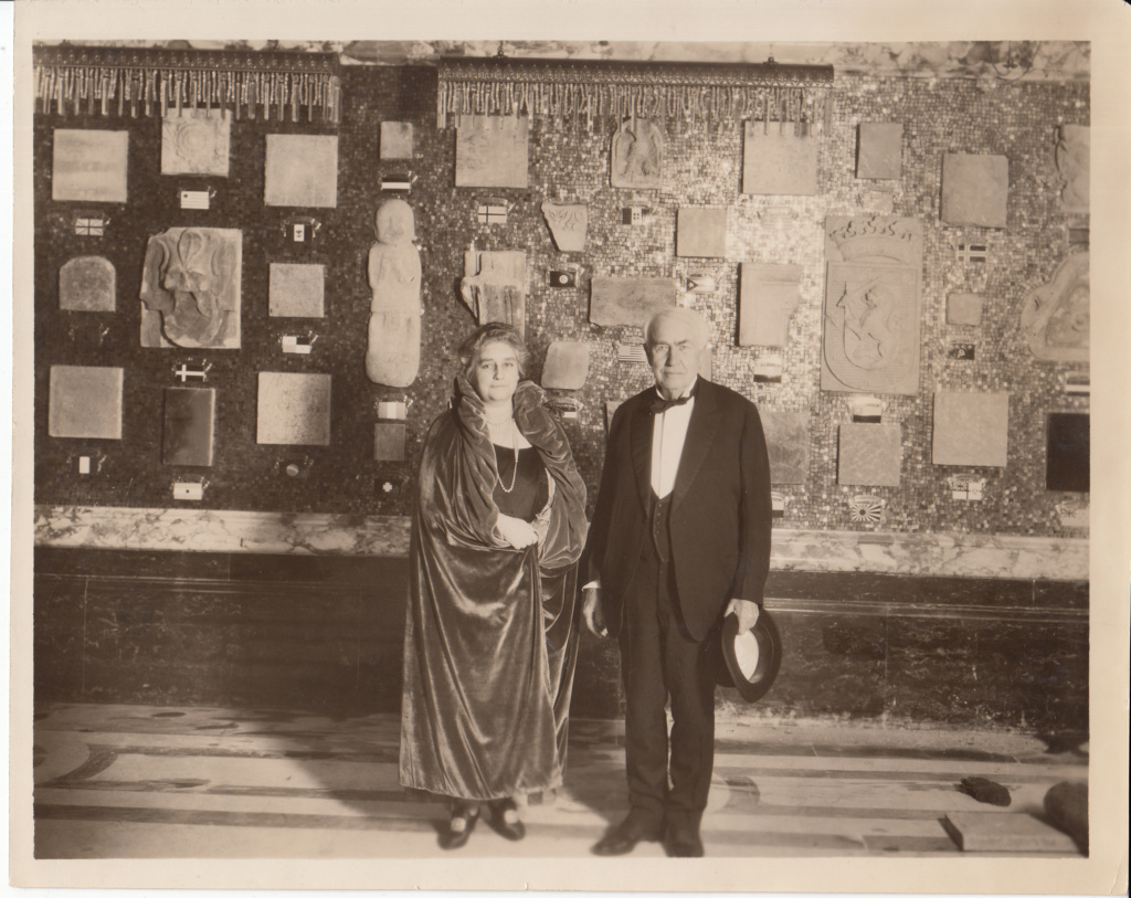 Live radio broadcasts were produced each evening airing the music conducted by the 70 piece orchestra to entice those not in attendance to attend a future show. In an interview and tour published in the New York Times on November 14, 1926 just days before the grand opening, Harold B. Franklin, vice president of the Publix Theatres Corporation and chairman of the Paramount Building committee, pointed out interesting and innovative aspects of the nearly completed “World’s Finest Theatre” making special note of the Grande Hall ceiling panel titled “Spirit of Light” by Louis Grell. On the same walking tour, Mr. Franklin pointed out the organ screens made of crystal on which a “tree of life” was designed into each organ grill cover. Mr. Franklin also made special note of a bronze bust statute of Aldolph Zukor created by artist Jo Davidson. In all, some 56 oil paintings by important American artists hung on the walls of the theatre. The Times Square Paramount is the only known theatre, of the approximate 400, large and small, that Rapp designed which included an American themed lounge incorporated into the design. The Times Square Paramount is of the finest example in spatial design by Rapp and Rapp. The Hall of Nations was designed with stones displayed from all the countries that Famous-Players Lasky conducted business within and were typically donated to the project by high ranking officials of each nation including presidents.
